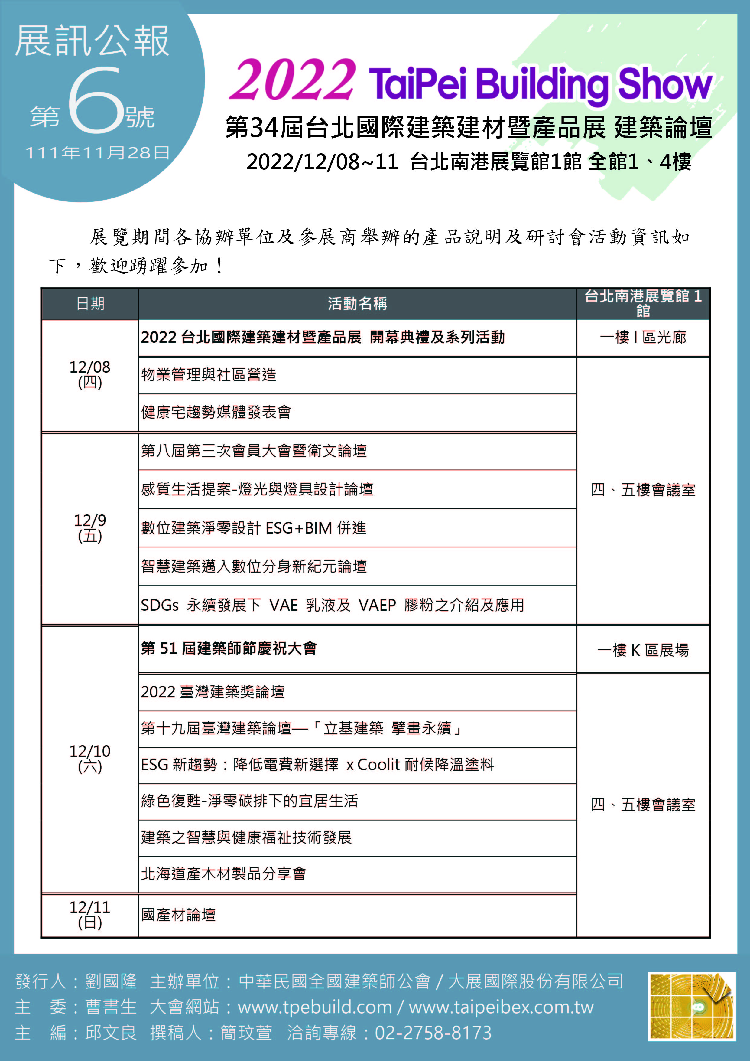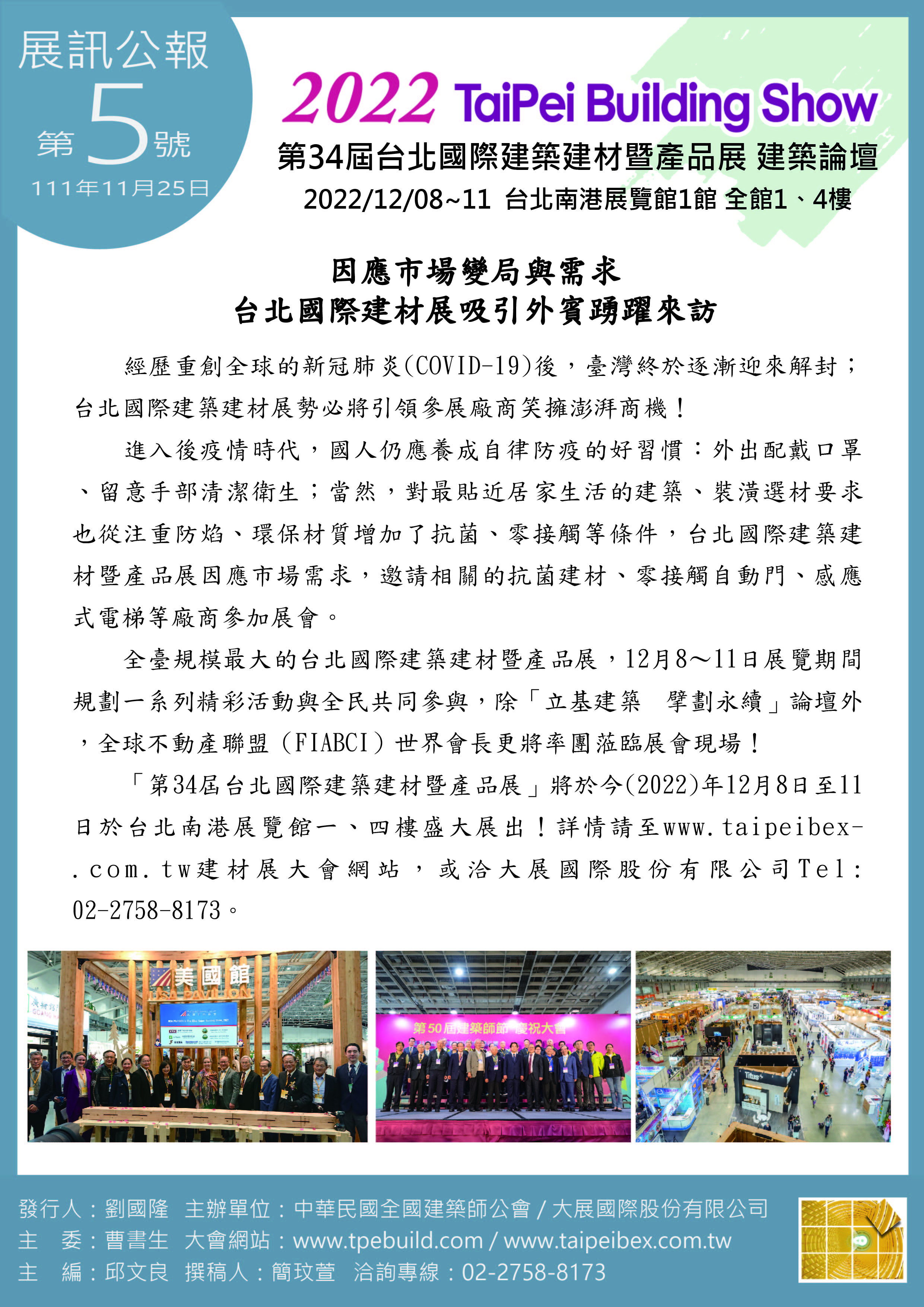 [公告] 轉知2022第34屆台北國際建築建材暨產品展 建築論壇_展訊公報第5、6號